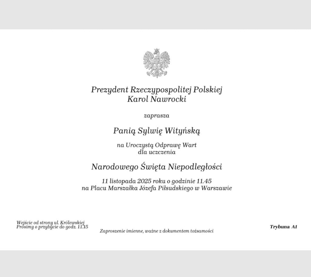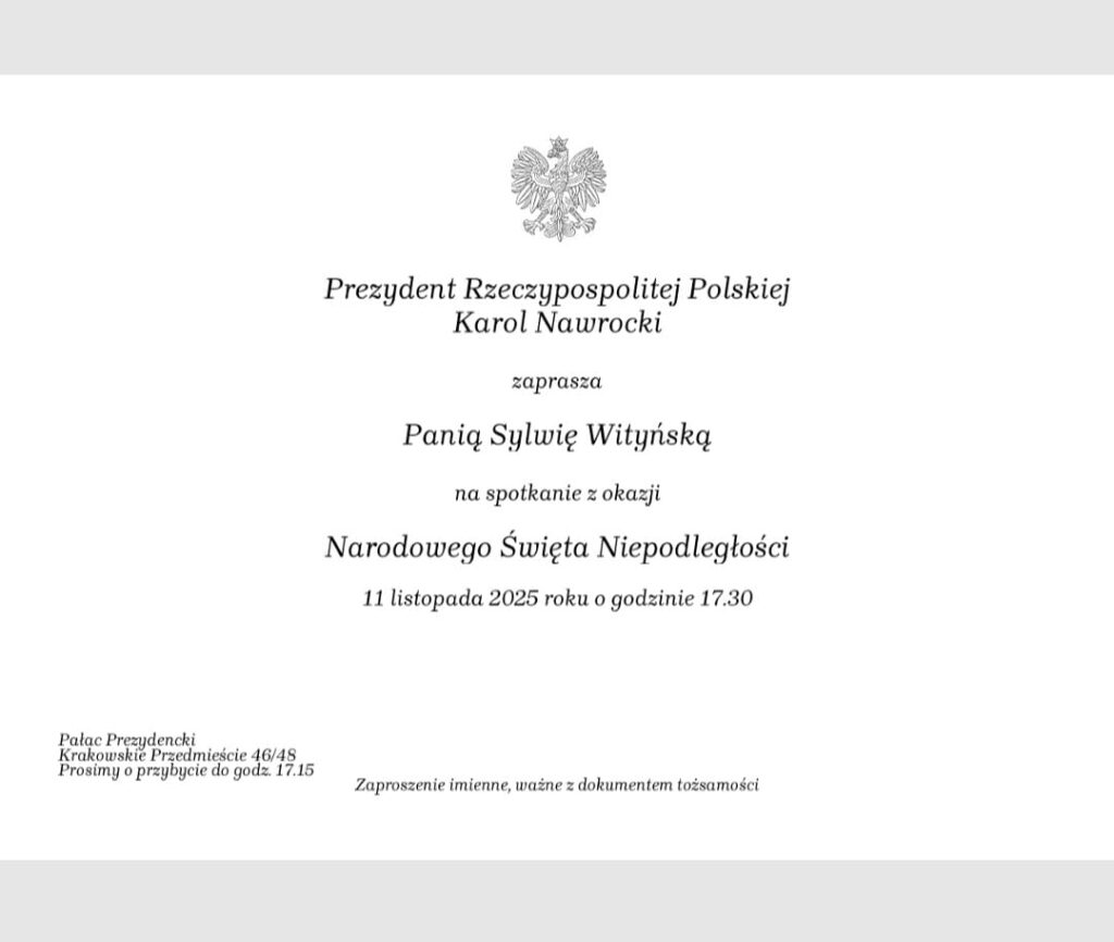 Miło nam poinformować, że pani Sylwia Wityńska, założyciel i dyrektor naszej szkoły, otrzymała zaproszenie od Prezydenta Rzeczypospolitej Polskiej na uroczystość z okazji obchodów Narodowego Święta Niepodległości.